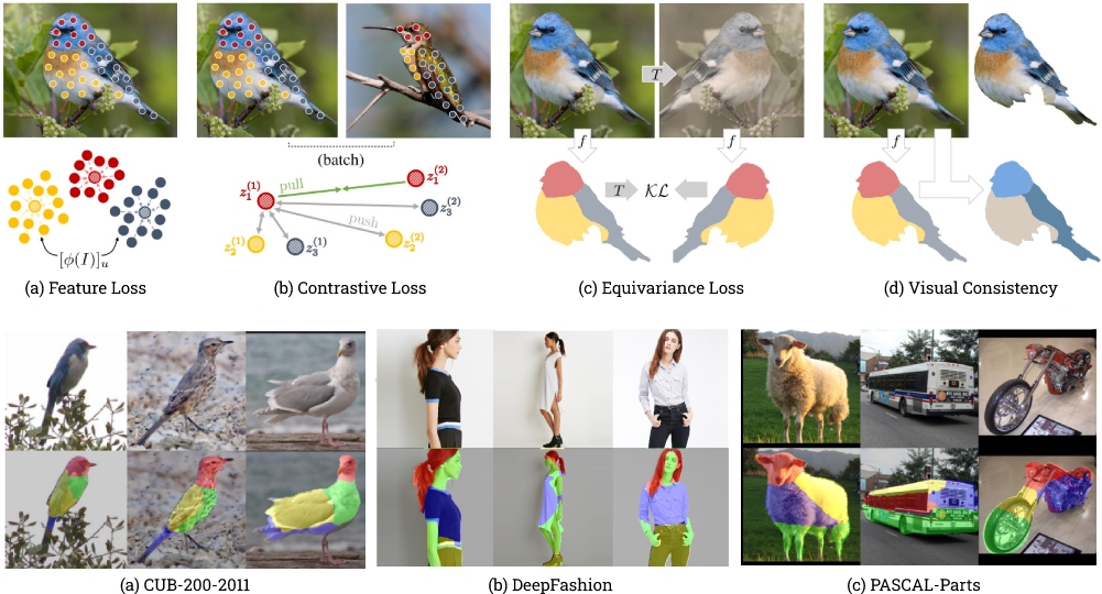 The goal of self-supervised visual representation learning is to learn strong, transferable image representations, with the majority of research focusing on object or scene level. On the other hand, representation learning at part level has received significantly less attention. In this paper, we propose an unsupervised approach to object part discovery and segmentation and make three contributions. First, we construct a proxy task through a set of objectives that encourages the model to learn a meaningful decomposition of the image into its parts. Secondly, prior work argues for reconstructing or clustering pre-computed features as a proxy to parts; we show empirically that this alone is unlikely to find meaningful parts; mainly because of their low resolution and the tendency of classification networks to spatially smear out information. We suggest that image reconstruction at the level of pixels can alleviate this problem, acting as a complementary cue. Lastly, we show that the standard evaluation based on keypoint regression does not correlate well with segmentation quality and thus introduce different metrics, NMI and ARI, that better characterize the decomposition of objects into parts. Our method yields semantic parts which are consistent across fine-grained but visually distinct categories, outperforming the state of the art on three benchmark datasets.